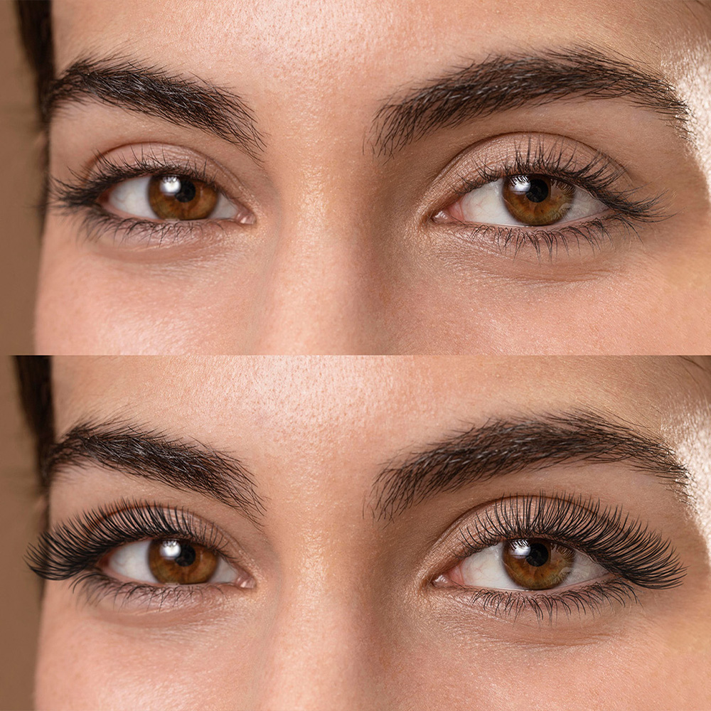 Treatment Details: Natural lashes are curled from the base to the tip, creating a lifted, voluminous look and semi-permanent dye is applied to the lashes for a darker, fuller appearance.